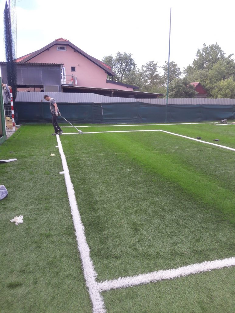 Obavljeni posao: Instalacija nogometne umjetne trave te strojna ispuna od suhog kvarcnog pijeska i gumenog granulata